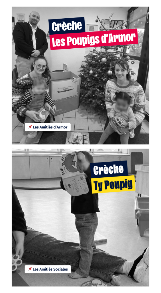 👶 L’Enfance : Des cadeaux pour les crèches « Poupig » à Rennes et « Les Poupigs d’Armor » à Brest (avec Les Amitiés Sociales et Les Amitiés d’Armor).